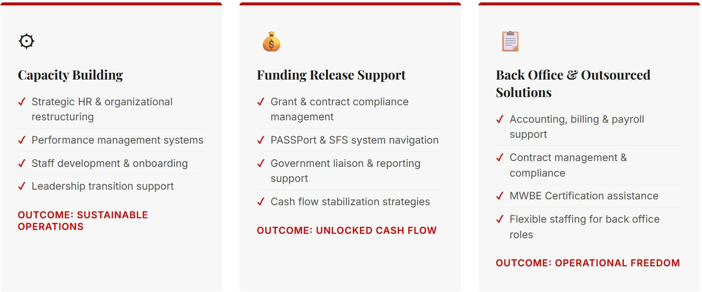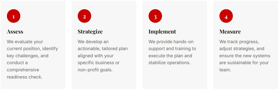 Every engagement is built around your specific operational reality; not a one-size-fits-all playbook. We focus on the three areas that most directly impact your ability to grow, retain staff, and sustain your mission.