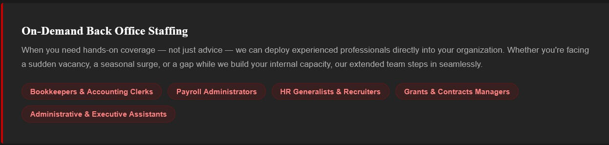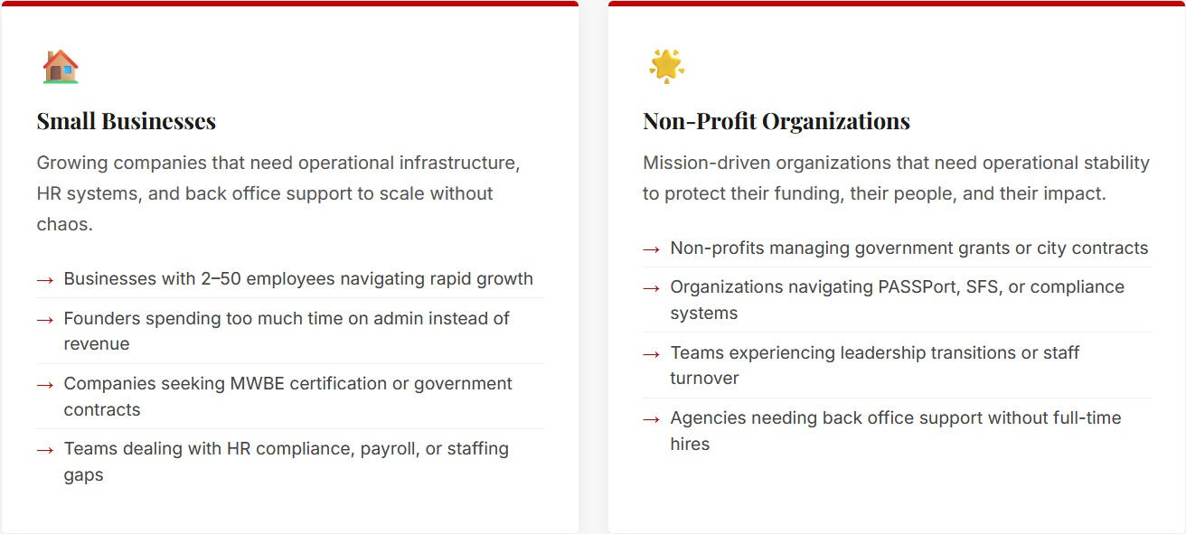 We work with leaders who know their organization is capable of more, but keep getting pulled back by operational drag. Whether you’re a solo founder wearing every hat, or a growing non-profit with a stretched team, if your back office hasn’t caught up with your ambition, you’re in the right place.
