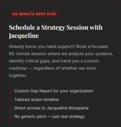 " My passion is to empower mission-driven organizations to scale responsibly. We don't create dependency; we create sustainability. You deserve the systems, knowledge, and confidence to thrive long after we've gone.— Jacqueline Bonaparte, Founder & Principal Consultant
